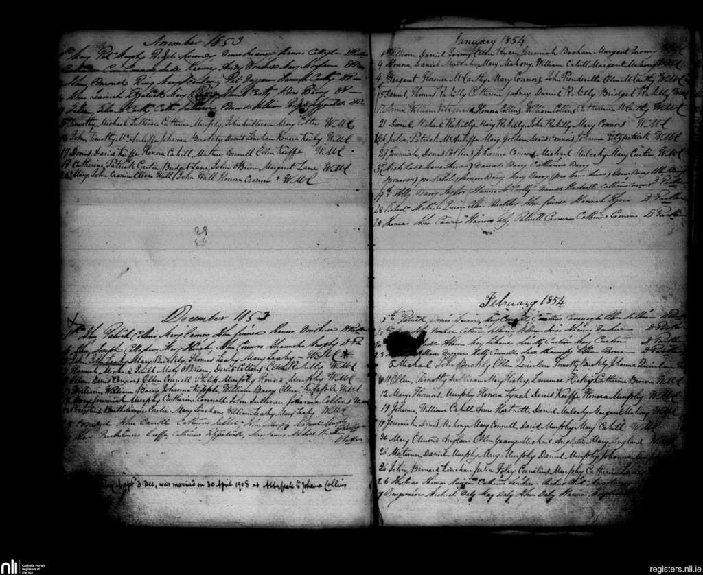 Newmarket; County of Cork; Diocese of Cloyne. Baptisms, Nov. 1853 to Feb. 1854