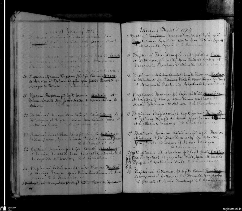 Askeaton; County of Limerick; Diocese of Limerick. Baptisms, Feb. 1874 to Mar. 1874