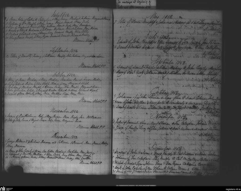 Ovens; County of Cork; Diocese of Cork and Ross. Baptisms, May 1852 to Dec. 1852