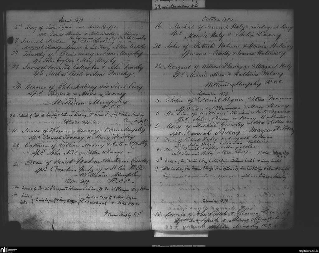 Ovens; County of Cork; Diocese of Cork and Ross. Baptisms, Aug. 1870 to Dec. 1870