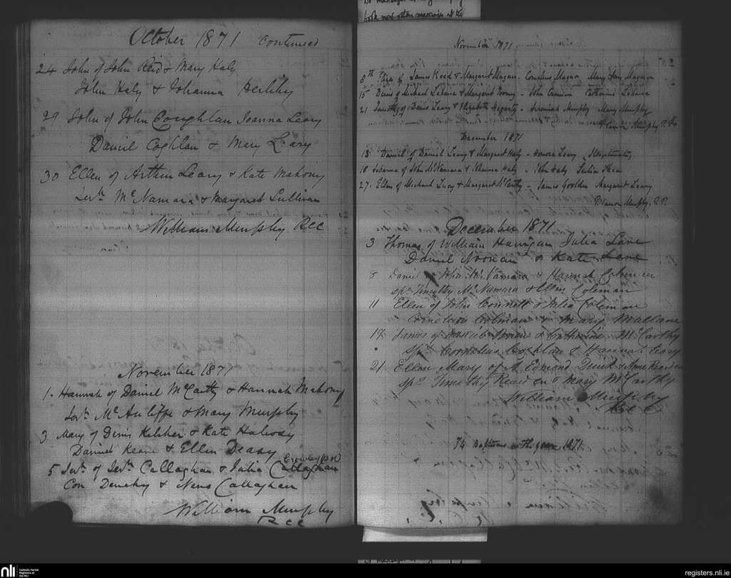Ovens; County of Cork; Diocese of Cork and Ross. Baptisms, Oct. 1871 to Dec. 1871