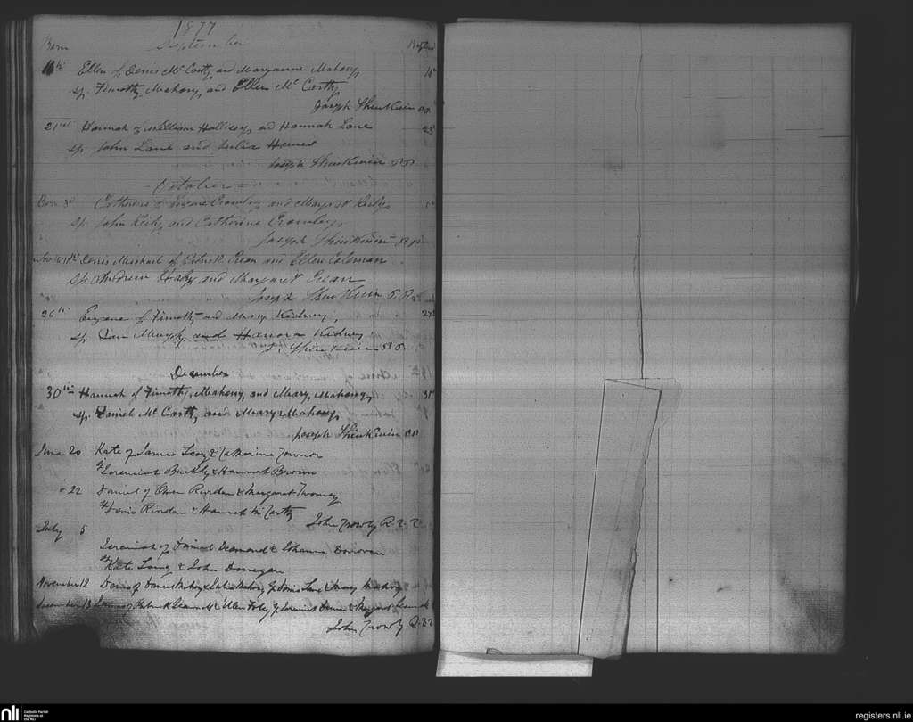 Ovens; County of Cork; Diocese of Cork and Ross. Baptisms, Sep. 1877 to Dec. 1877