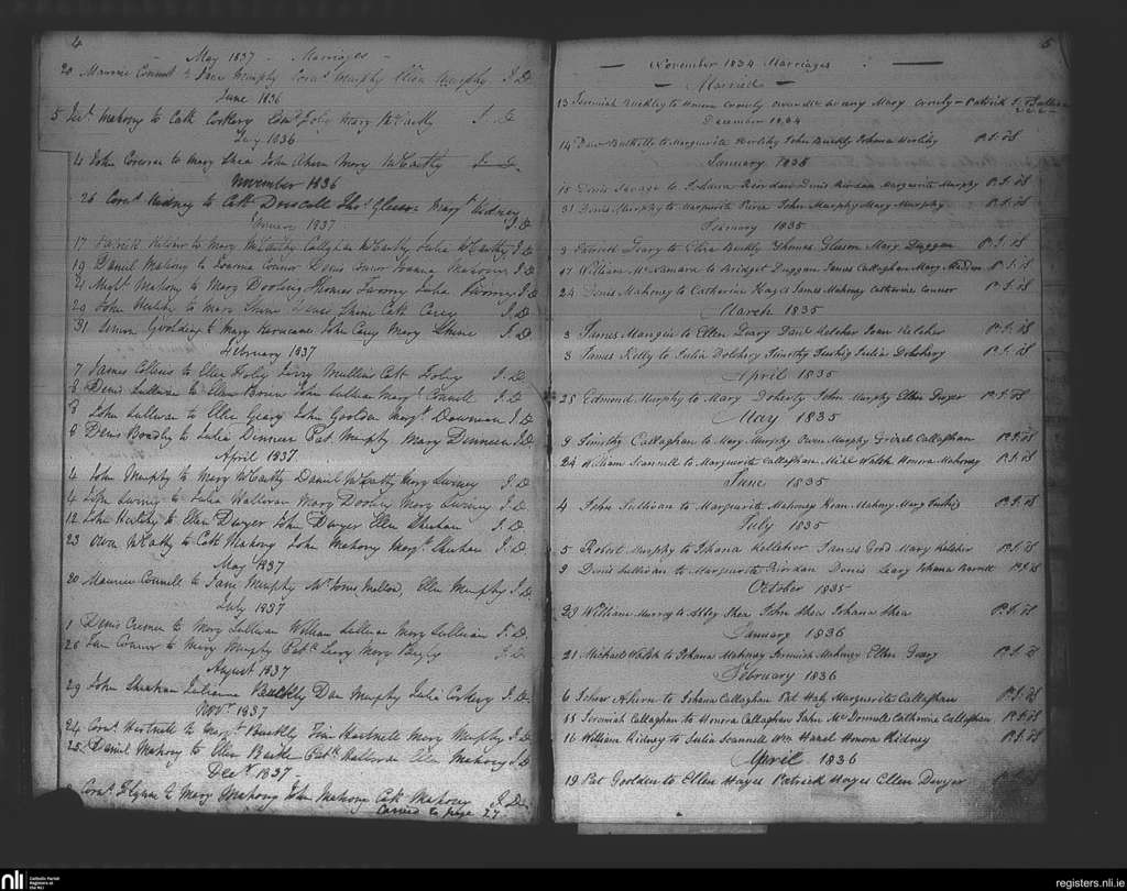 Ovens; County of Cork; Diocese of Cork and Ross. Marriages, Nov. 1834 to Dec. 1837