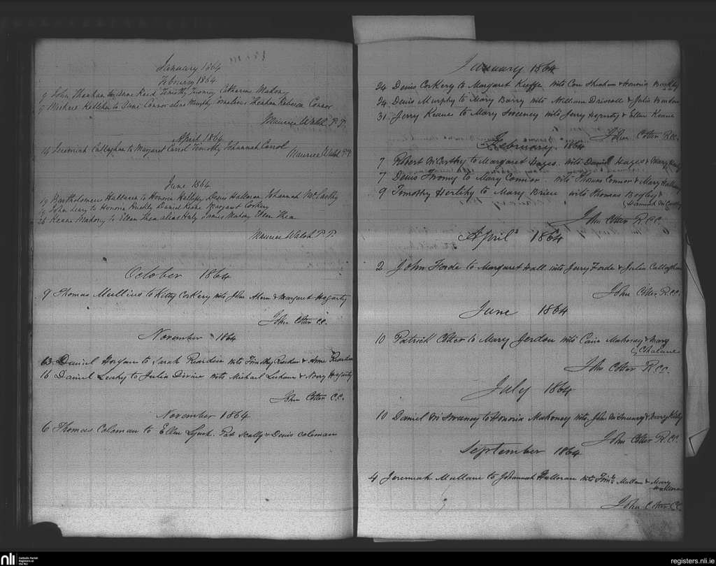 Ovens; County of Cork; Diocese of Cork and Ross. Marriages, Jan. 1864 to Nov. 1864