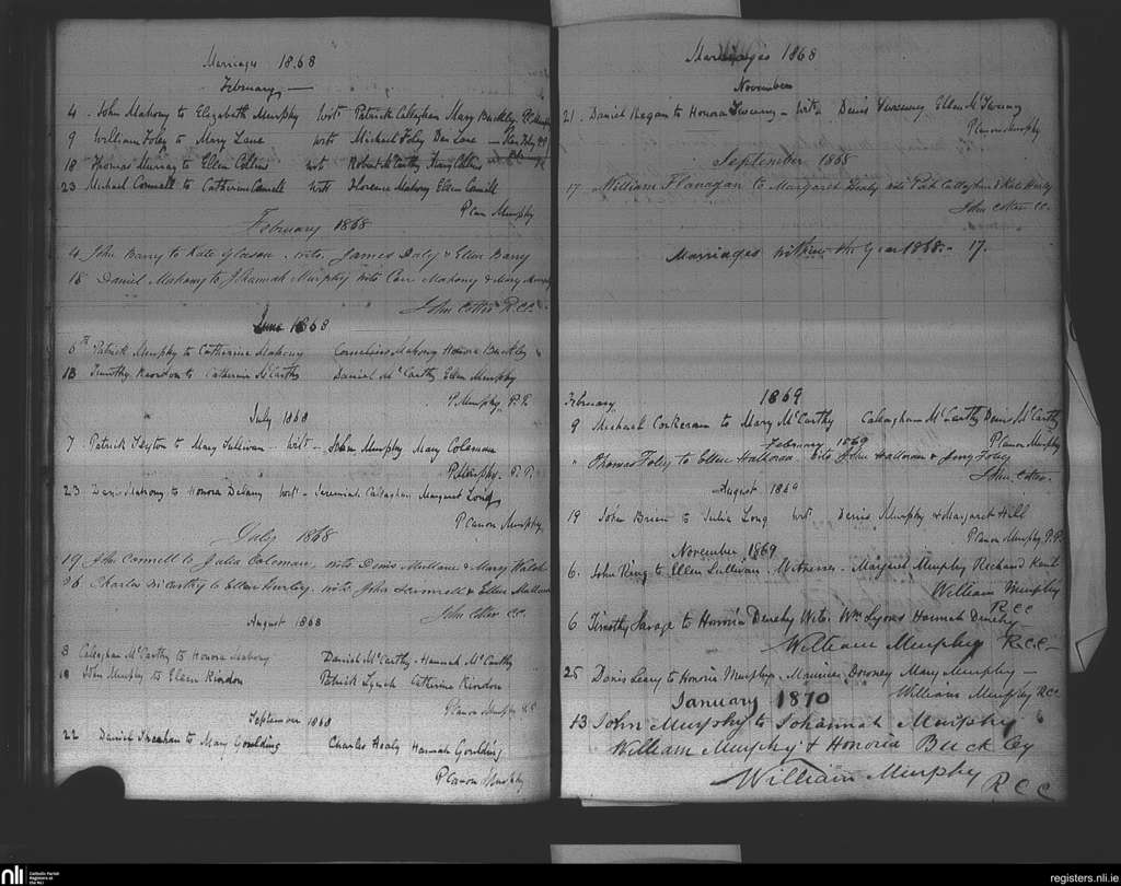 Ovens; County of Cork; Diocese of Cork and Ross. Marriages, Feb. 1868 to Jan. 1870