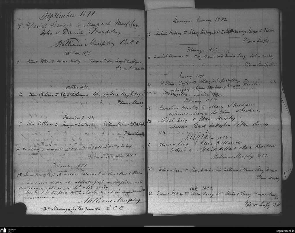 Ovens; County of Cork; Diocese of Cork and Ross. Marriages, Sep. 1871 to July 1872