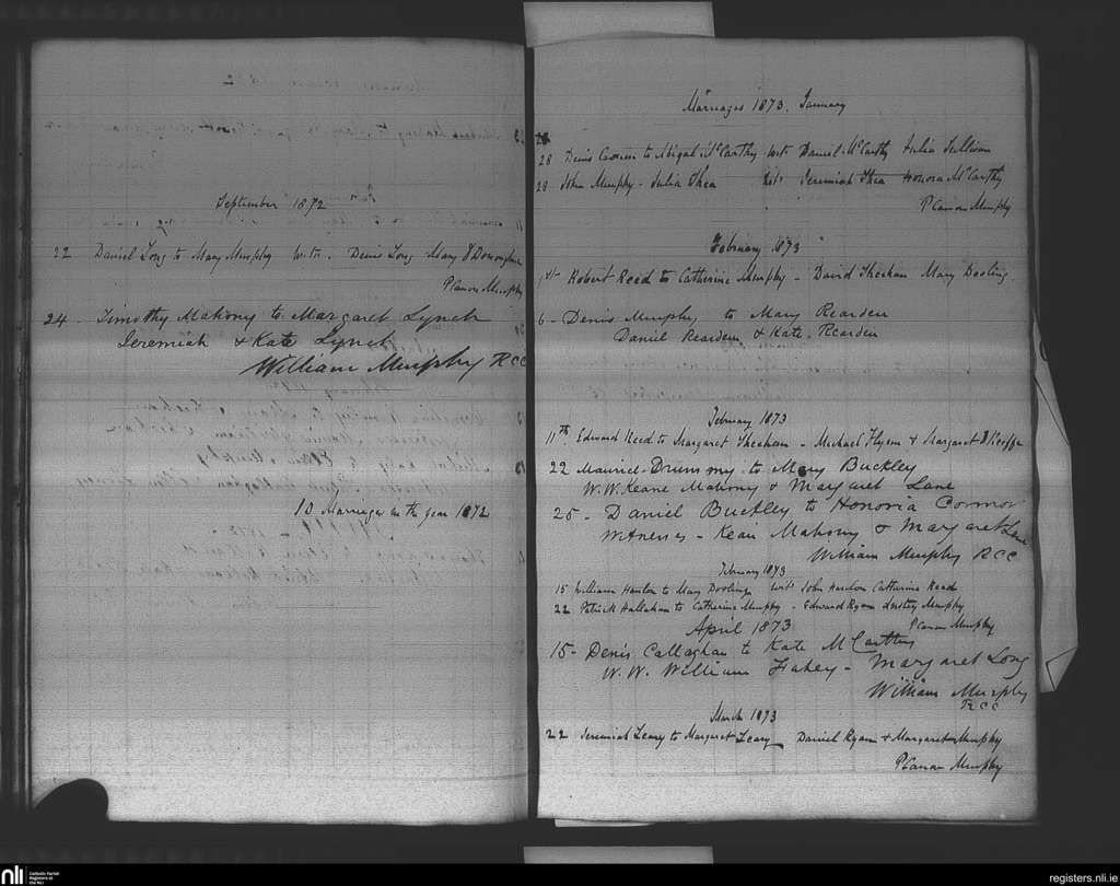 Ovens; County of Cork; Diocese of Cork and Ross. Marriages, Sep. 1872 to Apr. 1873