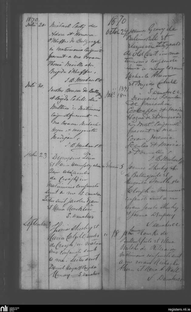 Croagh; County of Limerick; Diocese of Limerick. Marriages, July 1870 to Feb. 1871