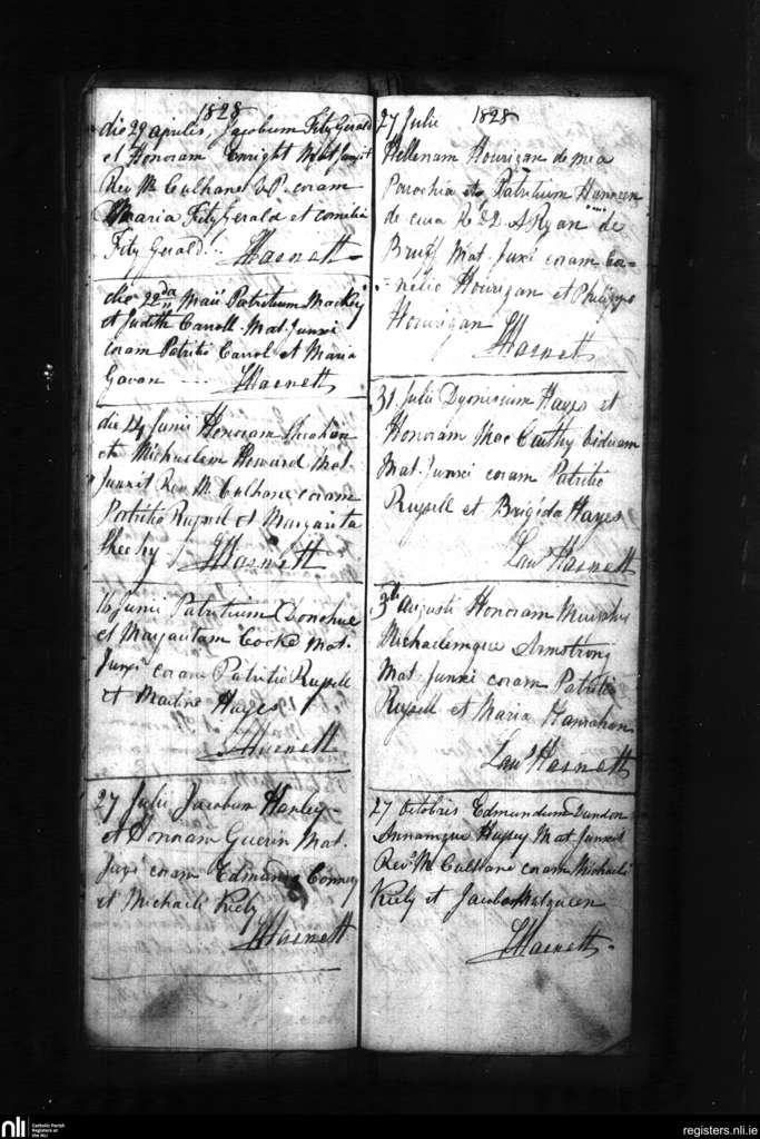 Croom; County of Limerick; Diocese of Limerick. Marriages, Apr. 1828 to Oct. 1828
