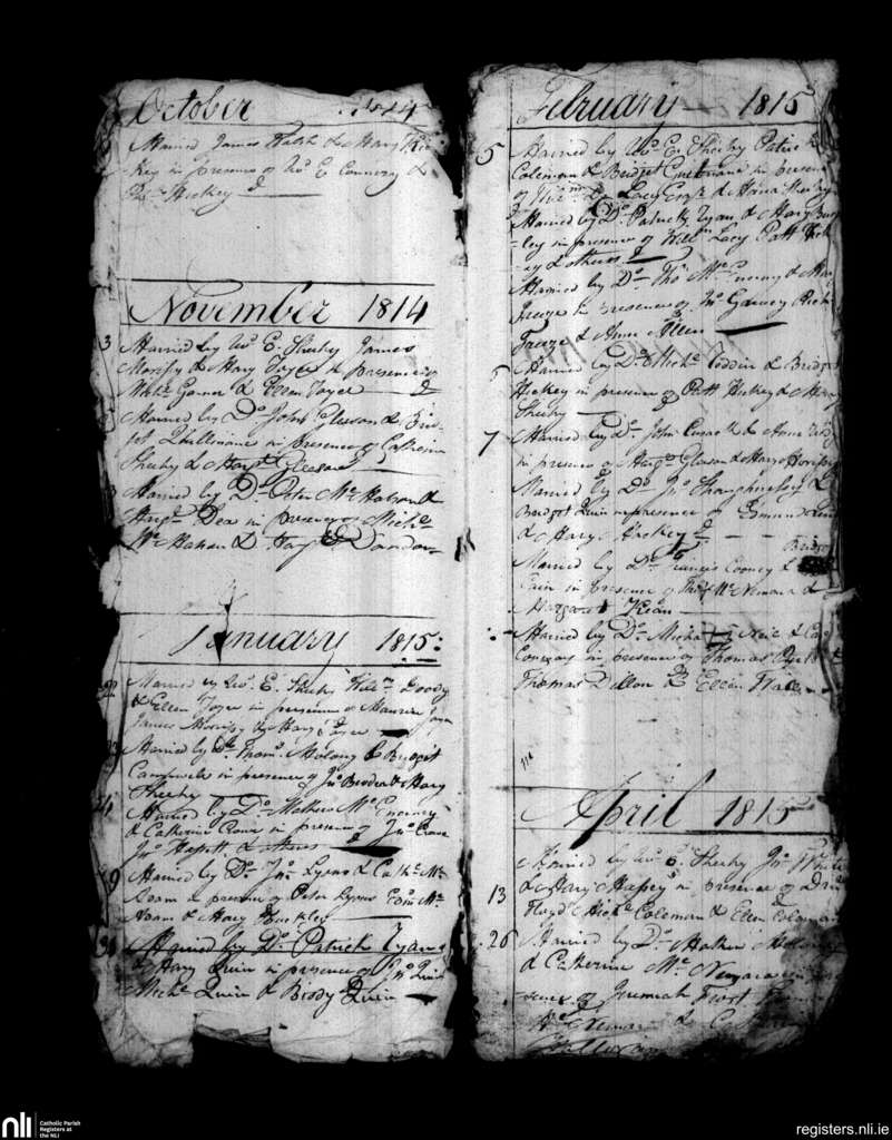 Parteen, Limerick city; County of Limerick, Clare; Diocese of Limerick. Marriages, Oct. 1814 to Apr. 1815