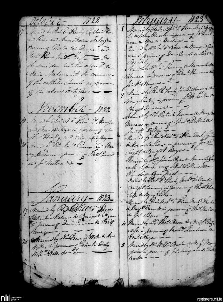 Parteen, Limerick city; County of Limerick, Clare; Diocese of Limerick. Marriages, Oct. 1822 to Feb. 1823