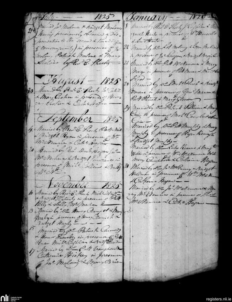 Parteen, Limerick city; County of Limerick, Clare; Diocese of Limerick. Marriages, July 1825 to Jan. 1826