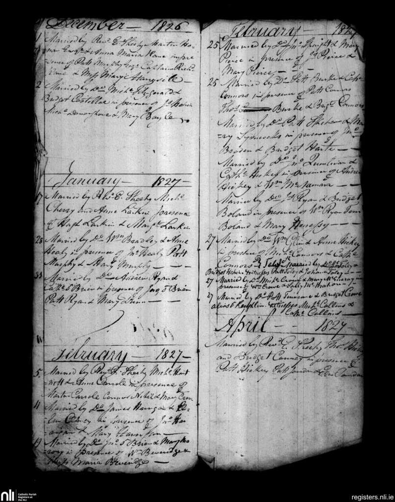 Parteen, Limerick city; County of Limerick, Clare; Diocese of Limerick. Marriages, Dec. 1826 to Apr. 1827