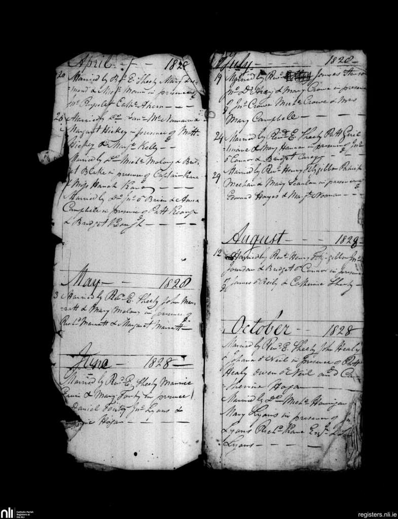 Parteen, Limerick city; County of Limerick, Clare; Diocese of Limerick. Marriages, Apr. 1828 to Oct. 1828