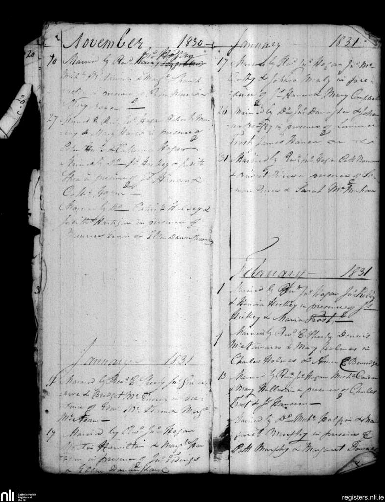 Parteen, Limerick city; County of Limerick, Clare; Diocese of Limerick. Marriages, Nov. 1830 to Feb. 1831