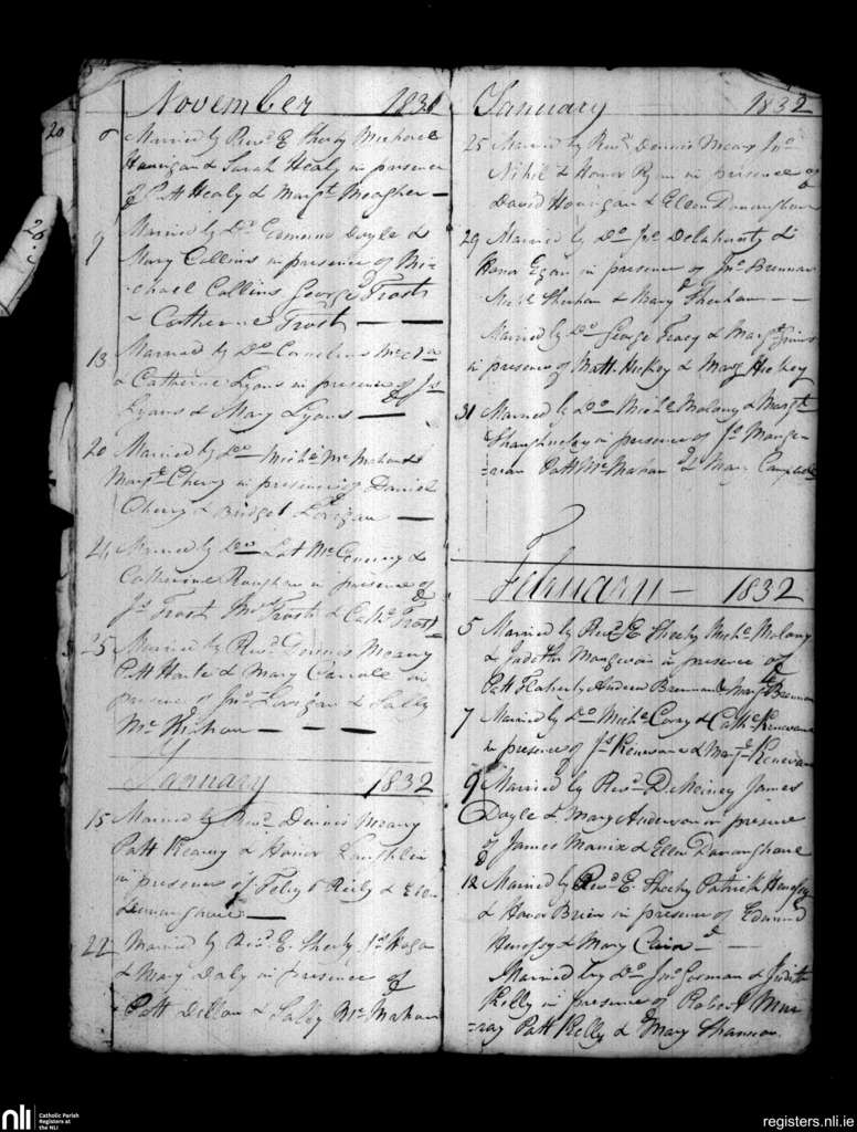 Parteen, Limerick city; County of Limerick, Clare; Diocese of Limerick. Marriages, Nov. 1831 to Feb. 1832
