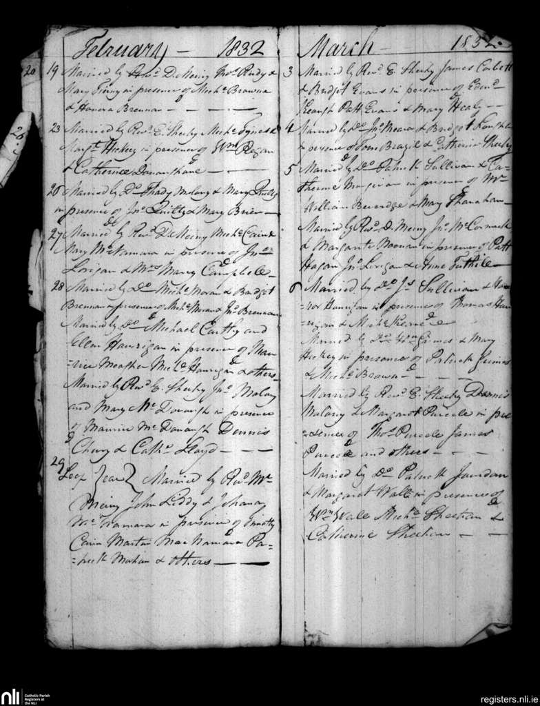 Parteen, Limerick city; County of Limerick, Clare; Diocese of Limerick. Marriages, Feb. 1832 to Mar. 1832