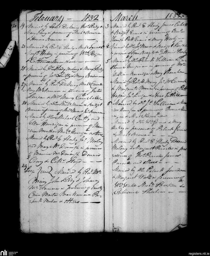 Parteen, Limerick city; County of Limerick, Clare; Diocese of Limerick. Marriages, Feb. 1832 to Mar. 1832