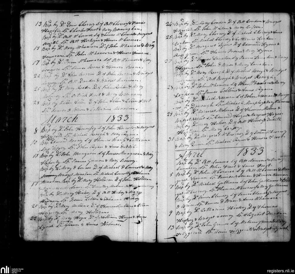 Parteen, Limerick city; County of Clare, Limerick; Diocese of Limerick. Baptisms, Feb. 1833 to Apr. 1833