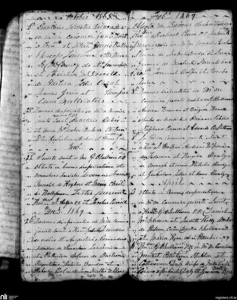 Parteen, Limerick city; County of Clare, Limerick; Diocese of Limerick. Marriages, Oct. 1868 to Apr. 1869