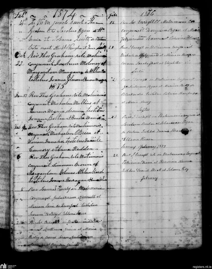 Parteen, Limerick city; County of Clare, Limerick; Diocese of Limerick. Marriages, Feb. 1874 to Feb. 1877