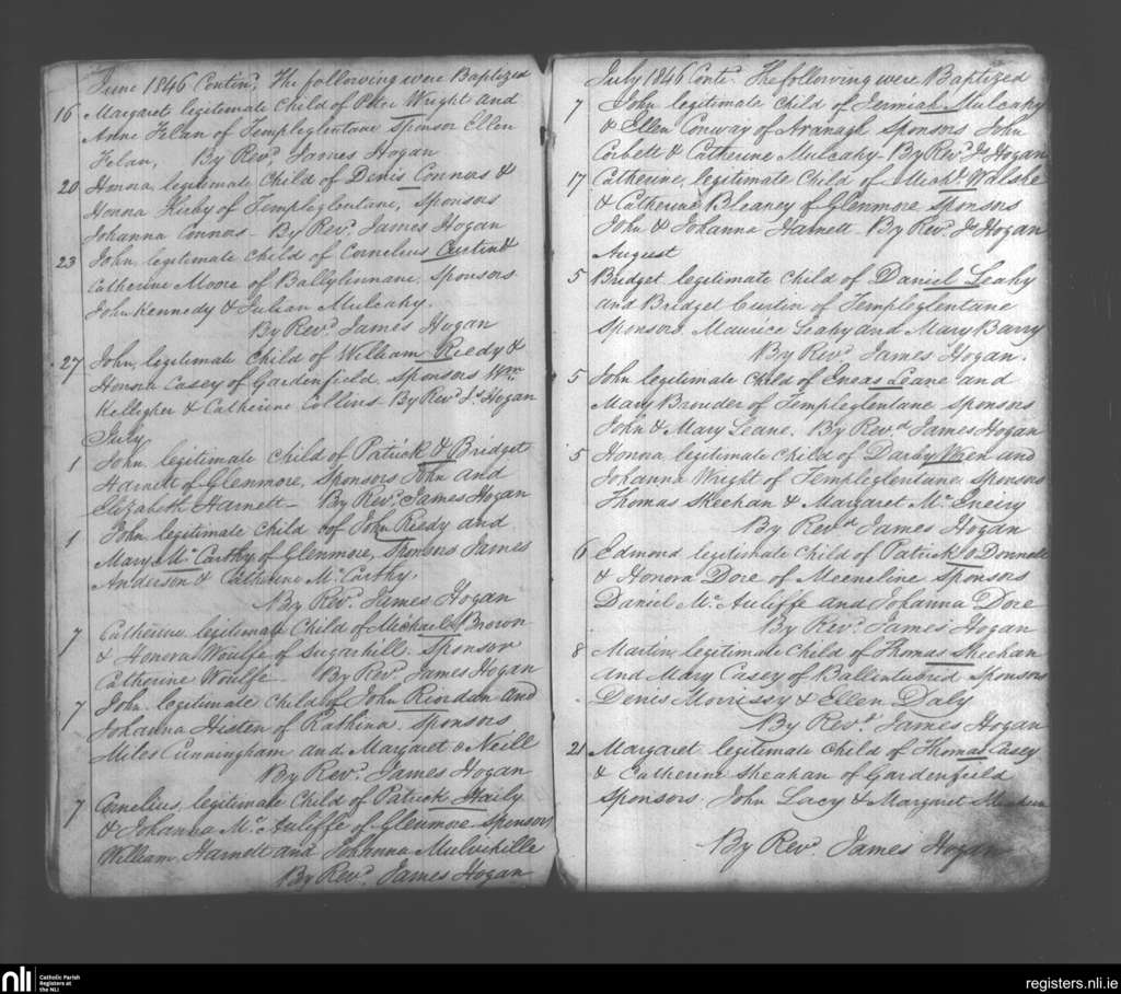 Monagea; County of Limerick; Diocese of Limerick. Baptisms, June 1846 to Aug. 1846