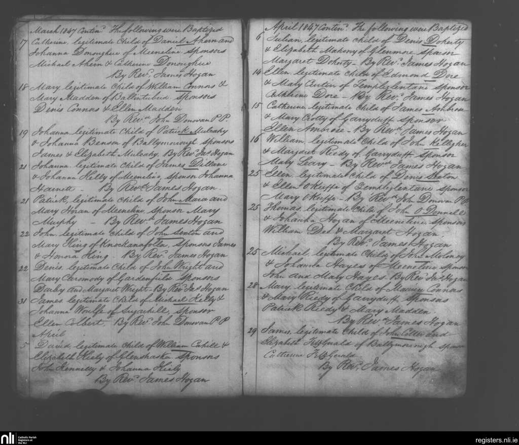 Monagea; County of Limerick; Diocese of Limerick. Baptisms, Mar. 1847 to Apr. 1847