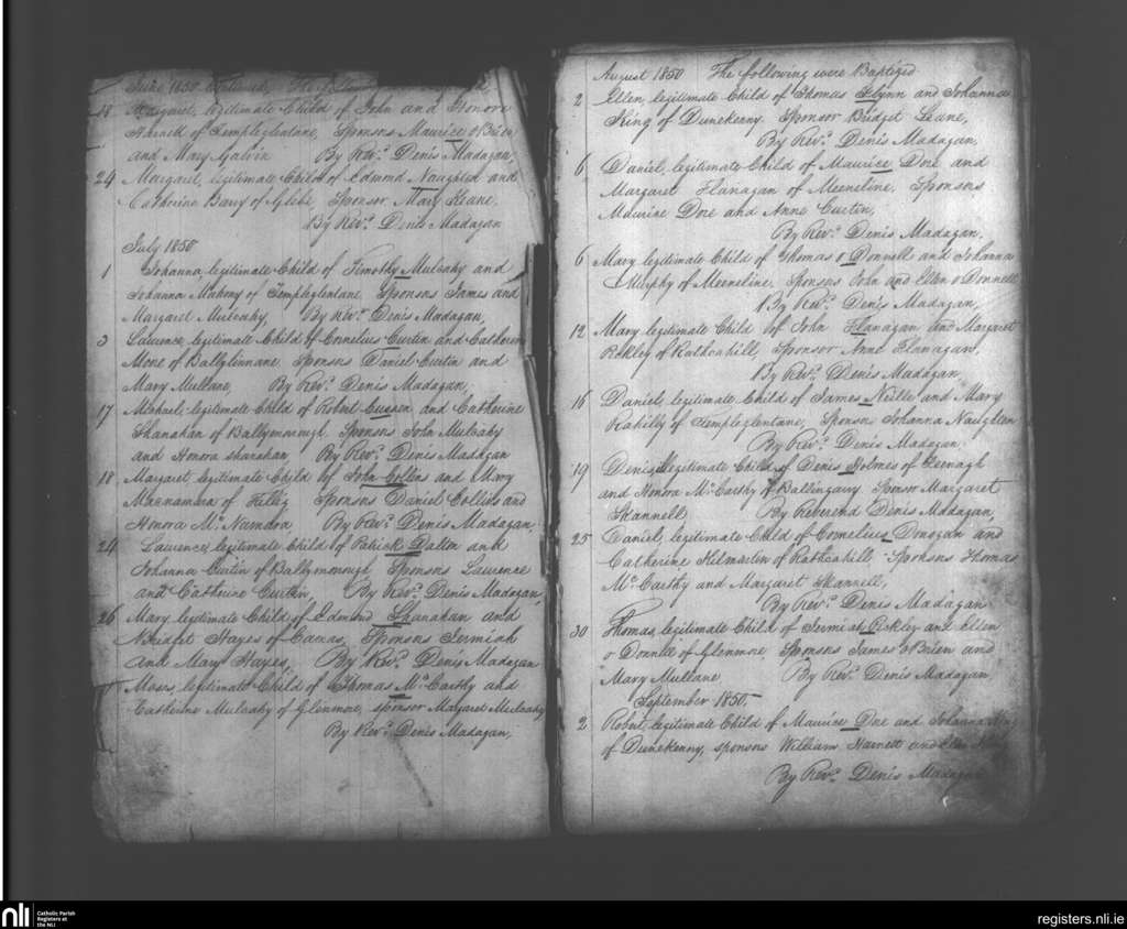 Monagea; County of Limerick; Diocese of Limerick. Baptisms, June 1850 to Sep. 1850