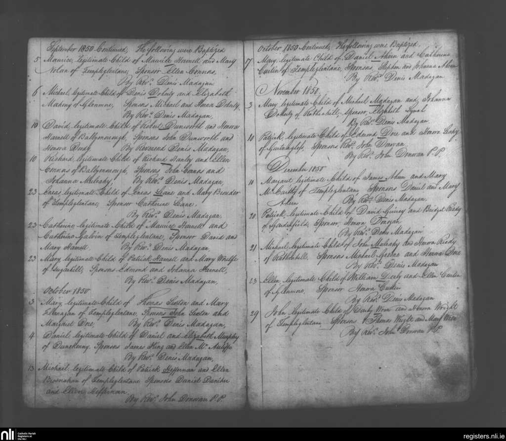 Monagea; County of Limerick; Diocese of Limerick. Baptisms, Sep. 1850 to Dec. 1850