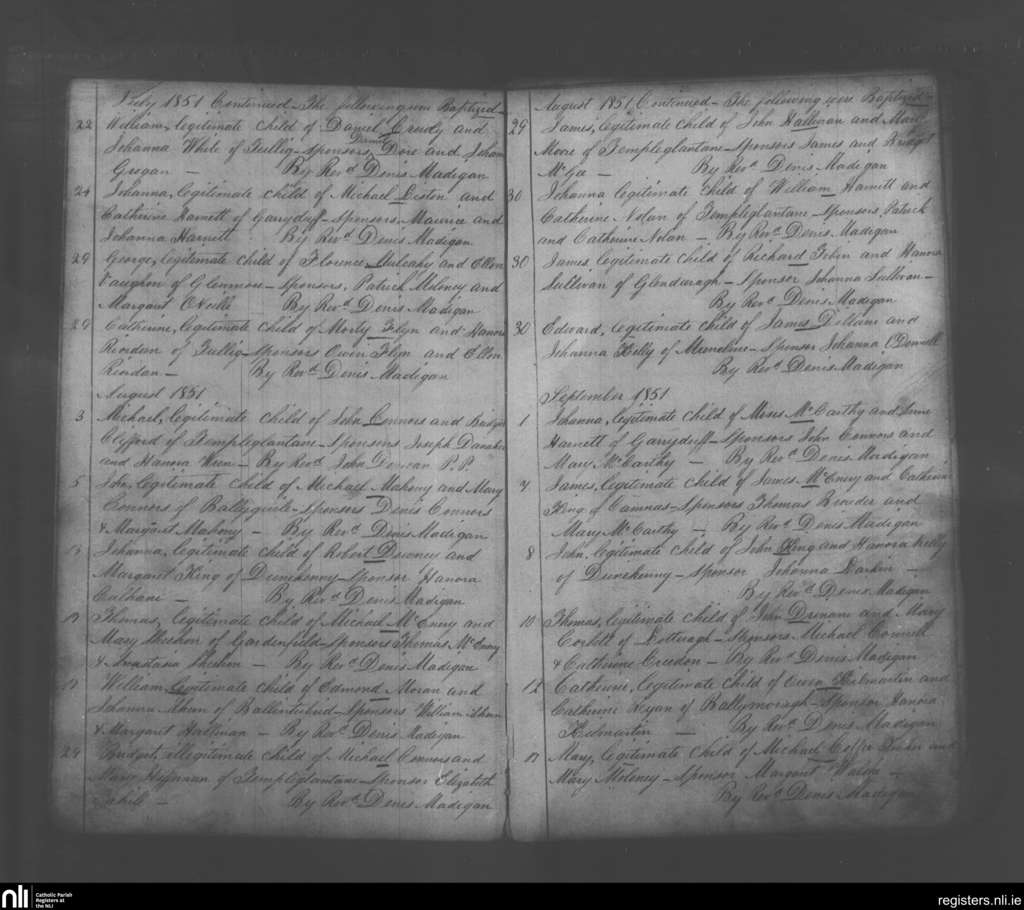 Monagea; County of Limerick; Diocese of Limerick. Baptisms, July 1851 to Sep. 1851
