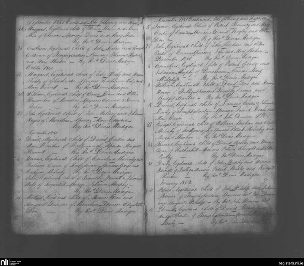 Monagea; County of Limerick; Diocese of Limerick. Baptisms, Sep. 1851 to Jan. 1852
