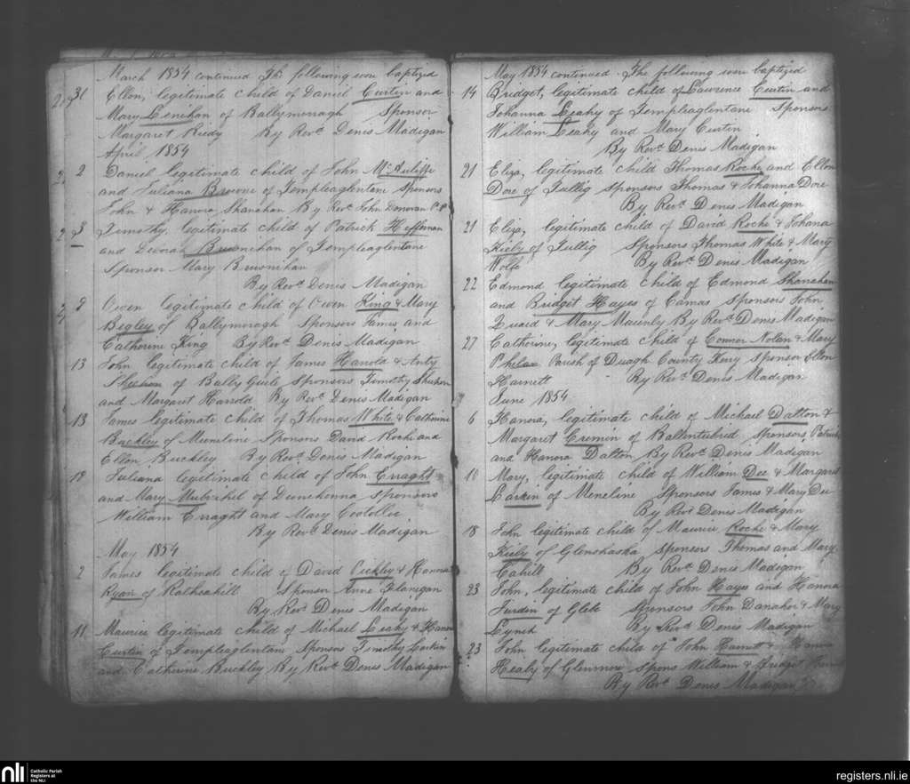 Monagea; County of Limerick; Diocese of Limerick. Baptisms, Mar. 1854 to June 1854