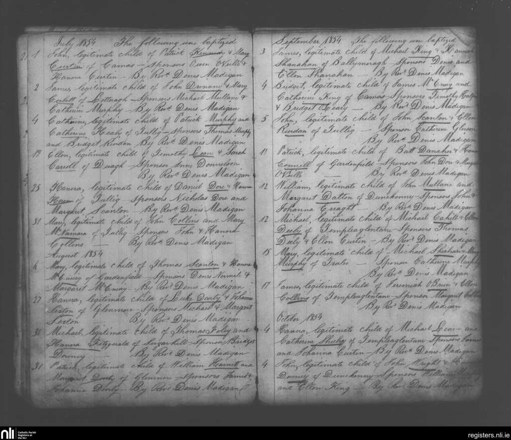 Monagea; County of Limerick; Diocese of Limerick. Baptisms, July 1854 to Oct. 1854