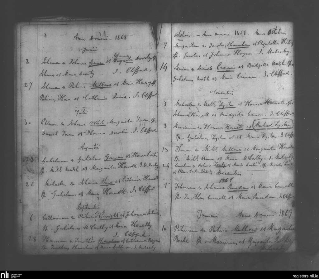 Monagea; County of Limerick; Diocese of Limerick. Baptisms, June 1868 to Jan. 1869