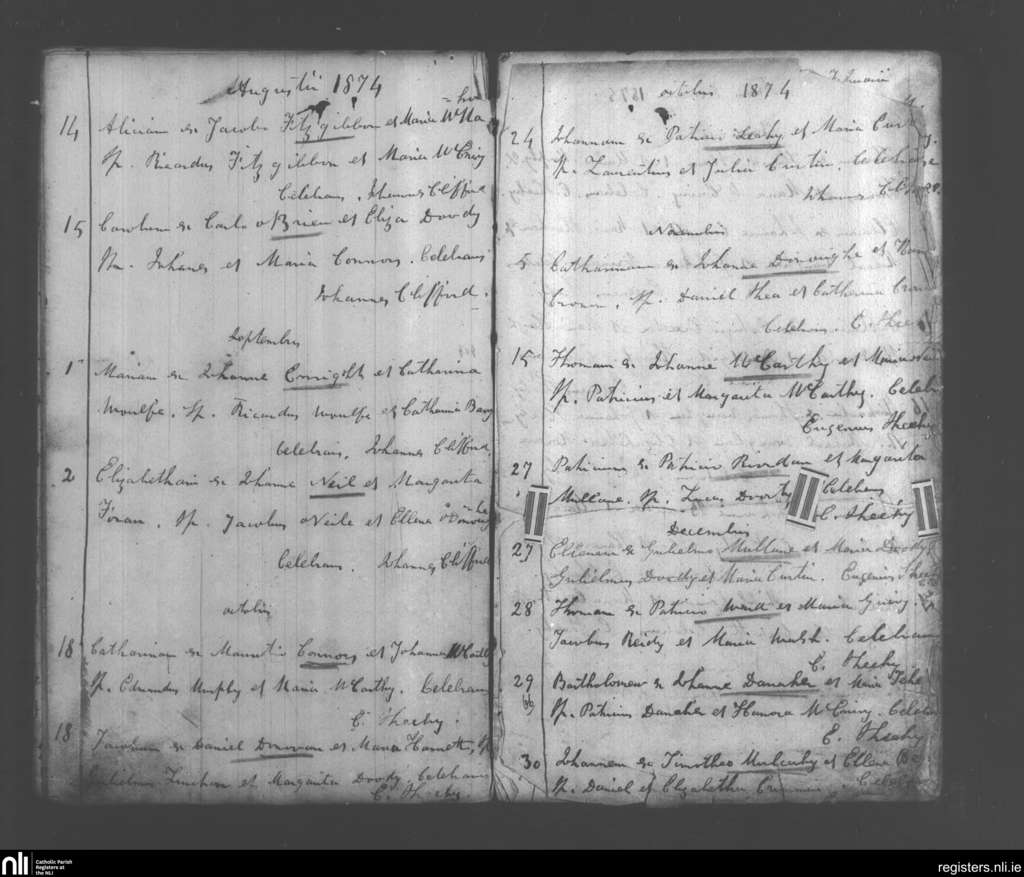 Monagea; County of Limerick; Diocese of Limerick. Baptisms, Aug. 1874 to Dec. 1874