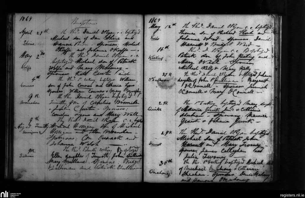 Tournafulla; County of Limerick; Diocese of Limerick. Baptisms, Apr. 1869 to May 1869