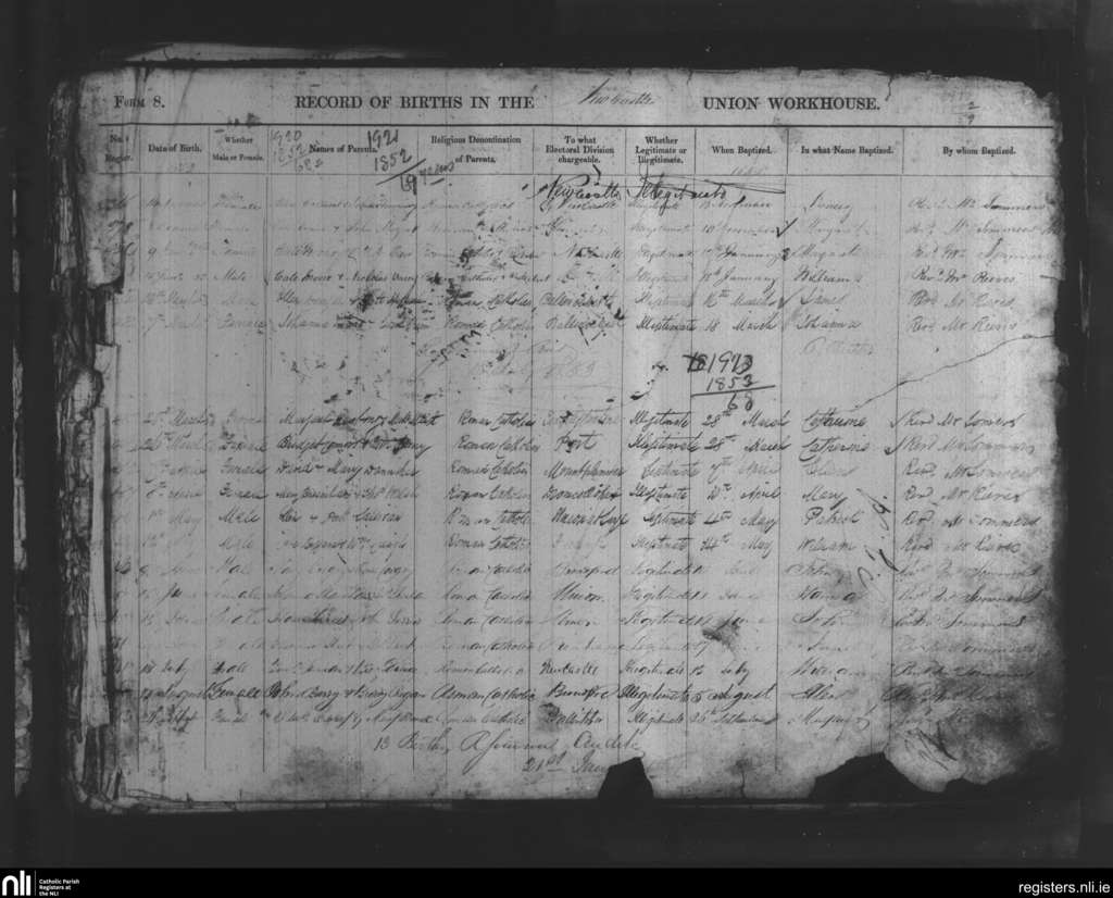 Newcastle Union Workhouse; County of Limerick; Diocese of Limerick. Baptisms, Nov. 1852 to Sep. 1853