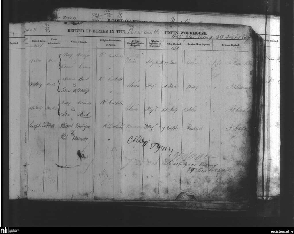 Newcastle Union Workhouse; County of Limerick; Diocese of Limerick. Baptisms, June 1869 to Sep. 1869