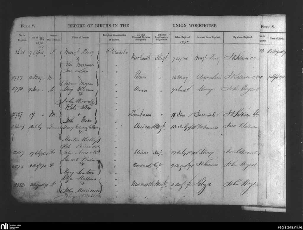 Newcastle Union Workhouse; County of Limerick; Diocese of Limerick. Baptisms, Apr. 1870 to Aug. 1870