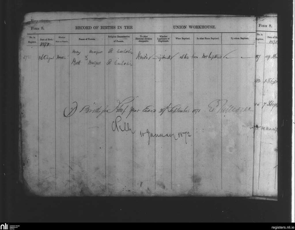 Newcastle Union Workhouse; County of Limerick; Diocese of Limerick. Baptisms, Aug. 1871