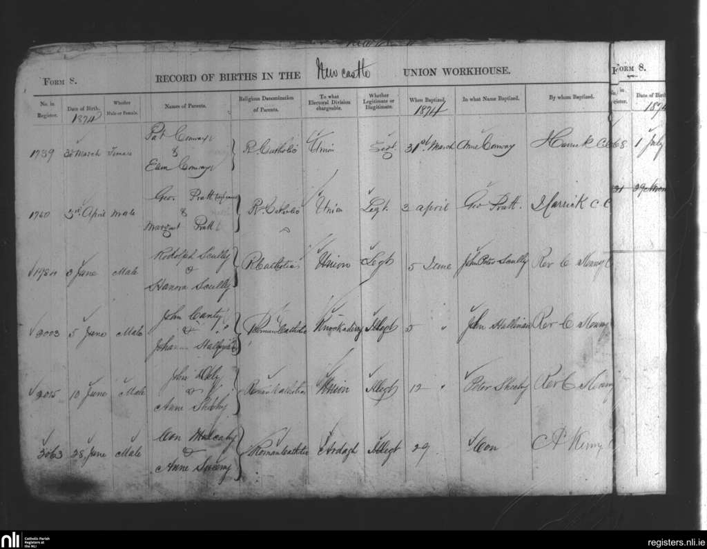 Newcastle Union Workhouse; County of Limerick; Diocese of Limerick. Baptisms, Mar. 1874 to June 1874