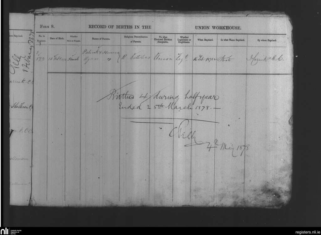 Newcastle Union Workhouse; County of Limerick; Diocese of Limerick. Baptisms, Feb. 1878