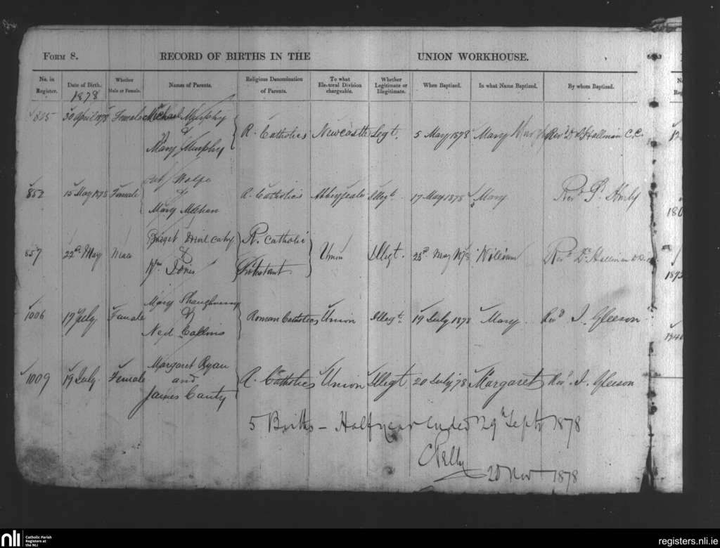 Newcastle Union Workhouse; County of Limerick; Diocese of Limerick. Baptisms, May 1878 to July 1878