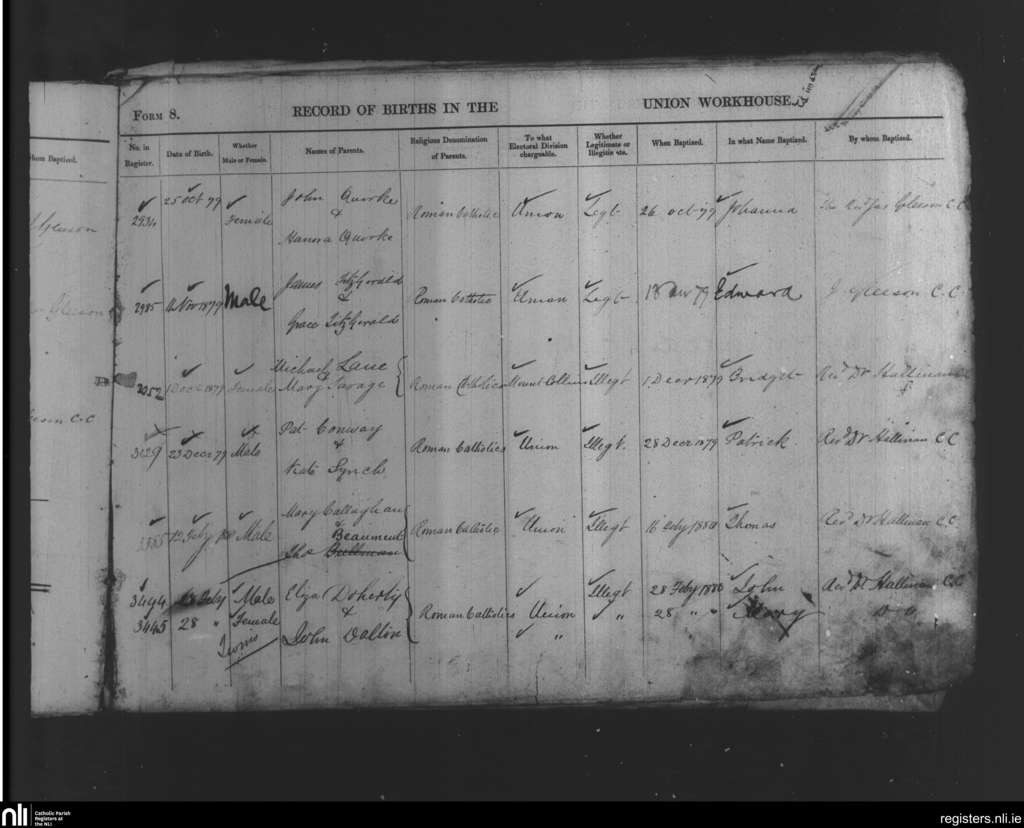 Newcastle Union Workhouse; County of Limerick; Diocese of Limerick. Baptisms, Oct. 1879 to Feb. 1880