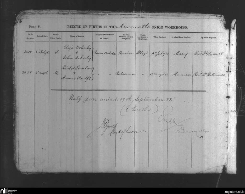 Newcastle Union Workhouse; County of Limerick; Diocese of Limerick. Baptisms, July 1883 to Aug. 1883