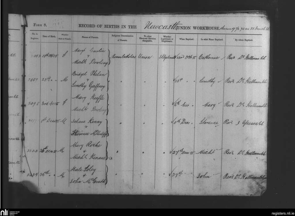 Newcastle Union Workhouse; County of Limerick; Diocese of Limerick. Baptisms, Oct. 1885 to Dec. 1885
