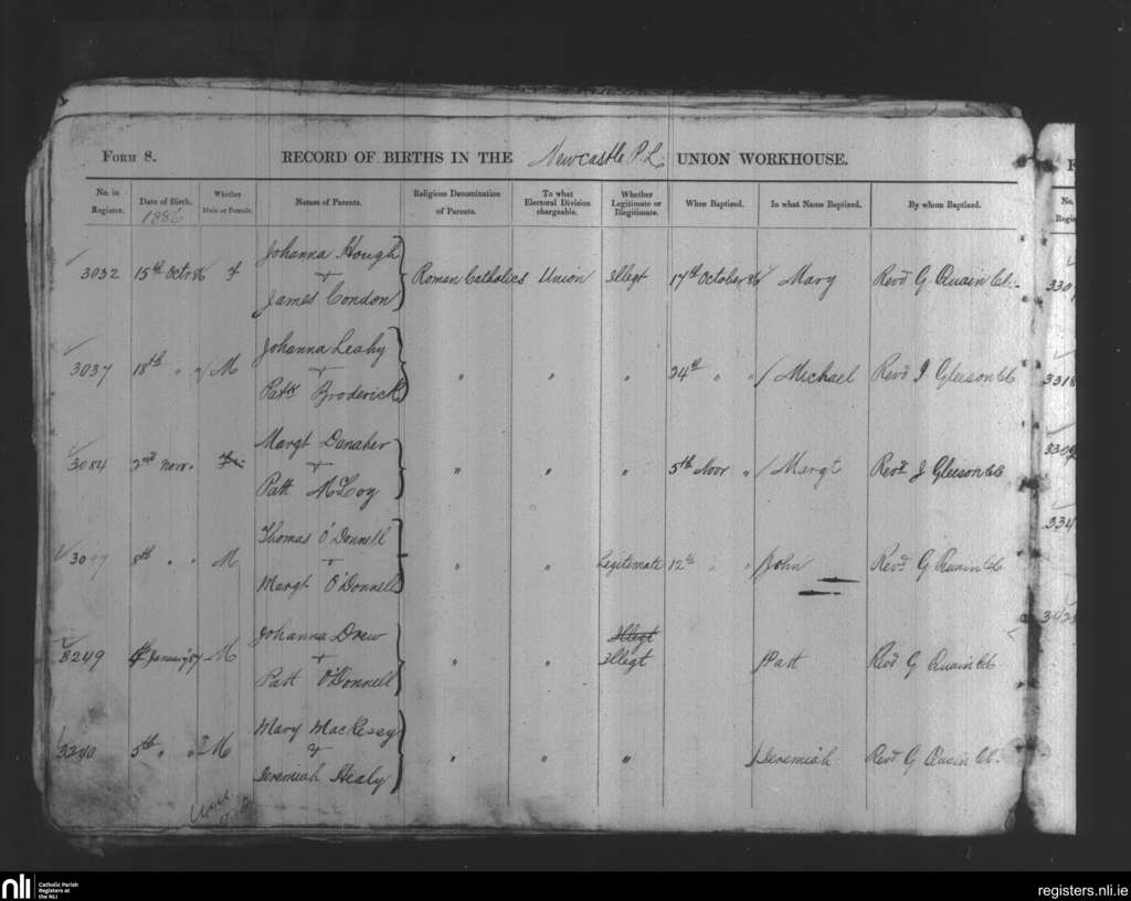 Newcastle Union Workhouse; County of Limerick; Diocese of Limerick. Baptisms, Oct. 1886 to Nov. 1886
