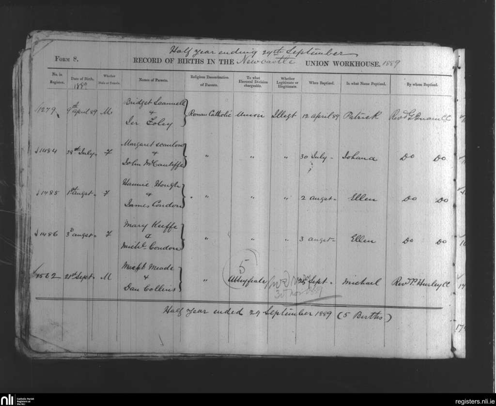 Newcastle Union Workhouse; County of Limerick; Diocese of Limerick. Baptisms, Apr. 1889 to Sep. 1889