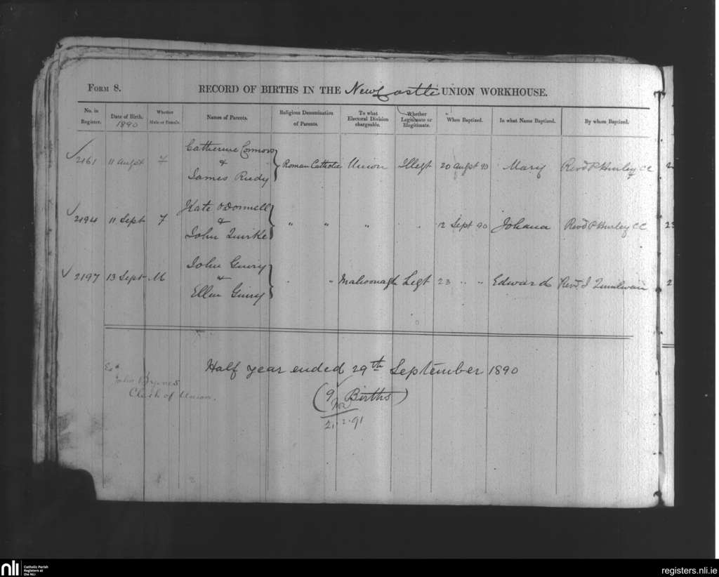 Newcastle Union Workhouse; County of Limerick; Diocese of Limerick. Baptisms, Aug. 1890 to Sep. 1890