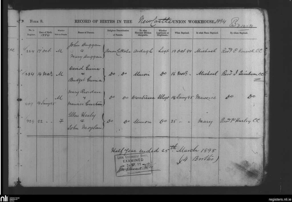 Newcastle Union Workhouse; County of Limerick; Diocese of Limerick. Baptisms, Oct. 1894 to Jan. 1895